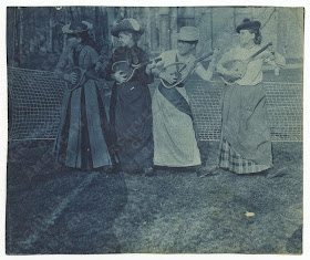 Cuatro mujeres de pie sobre una pista de tenis celebrando con sus raquetas, como si fueran guitarras, ( 1900)