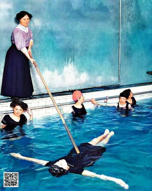 Una cápsula visual fascinante de la historia social y deportiva de principios del siglo XX: una clase de natación en la YWCA de Toronto en 1908, dirigida por una instructora que, desde el borde de la piscina, guía a las alumnas con un largo palo de asistencia.